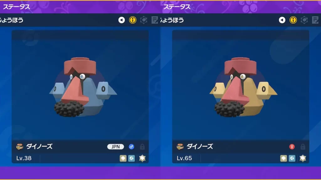 ダイノーズの色違いは、通常よりも茶色がかったボディが特徴です。『ポケモン スカーレット・バイオレット』では、キタカミの里・楽土の荒地で進化前のノズパスが出現するため、そこから色違い厳選を行うのが一般的です。