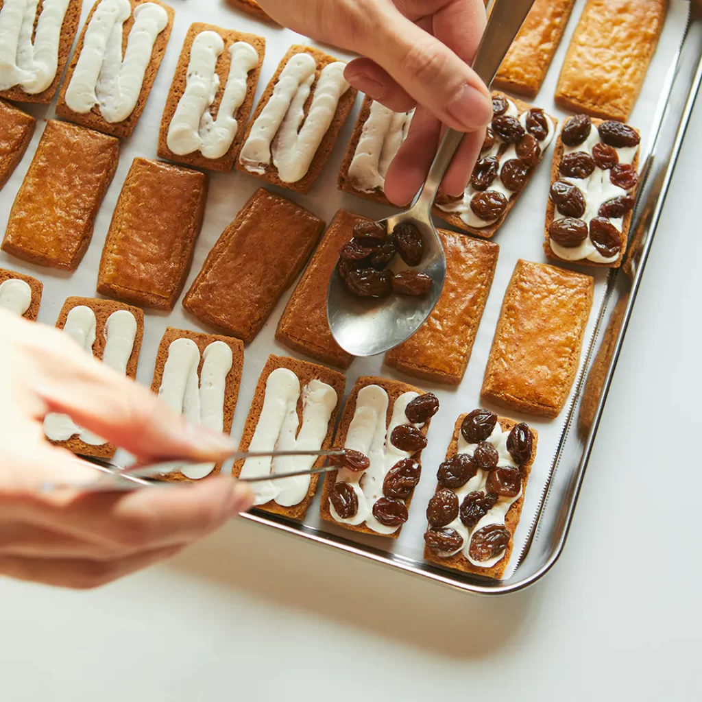 製造を担当するのは、人気洋菓子店Equalの後藤裕一パティシエ。アートディレクションは田部井美奈氏が手がけ、食の専門家・パティシエ・デザイナーの3者によるコラボでブランドが構築されています。このチーム体制が、ノーレーズンサンドの“可愛さと上質さの共存”を支えているのです。